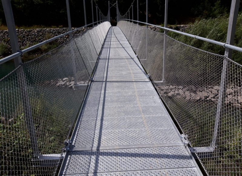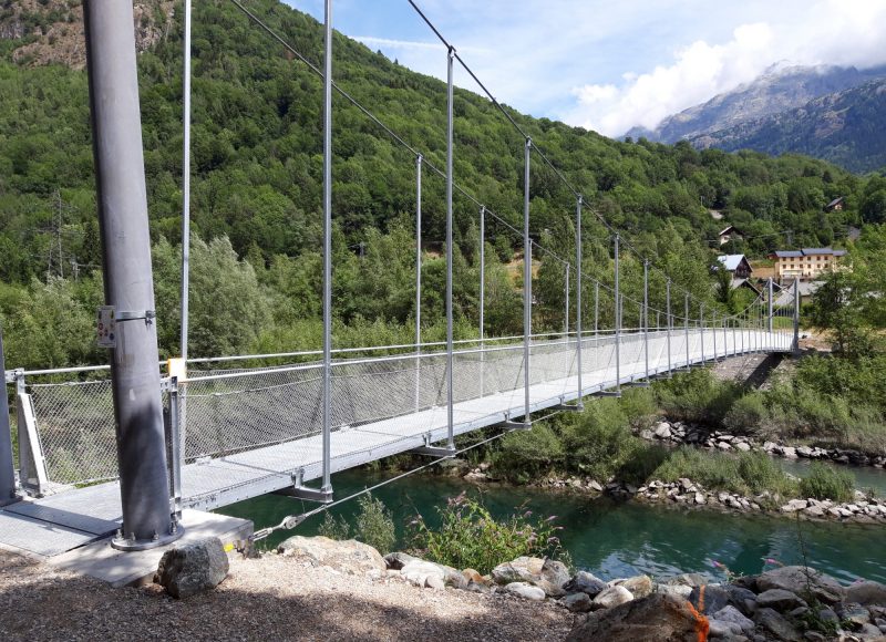 Construction de notre première passerelle suspendue, 70m de portée pour permettre aux piétons d’enjamber aisément l’Eau d’Olle