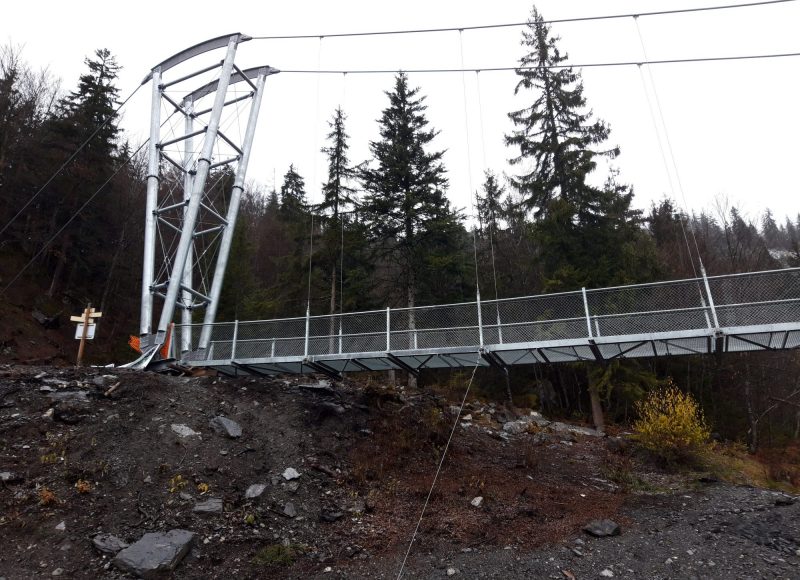 Fourniture et montage des mats de déviation et des câbles de notre deuxième passerelle suspendue pour cette fois réaliser un grand pas de 150m au-dessus du nant Bordon