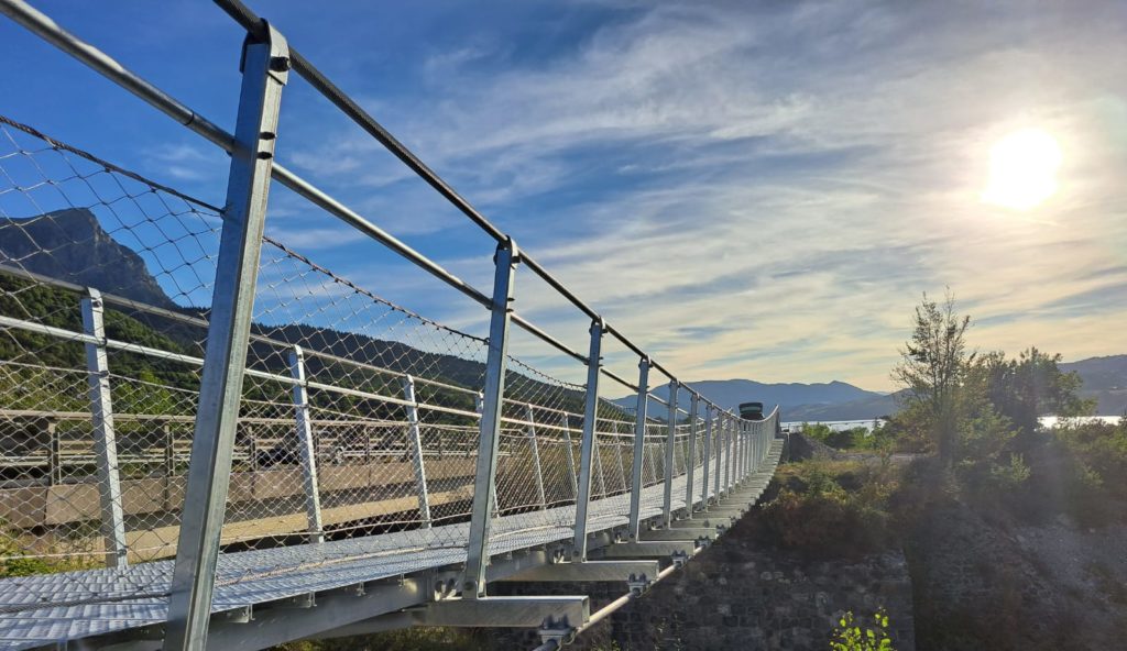 Une passerelle dans l’aménagement de la retenue du Cassioz à Praz sur Arly.