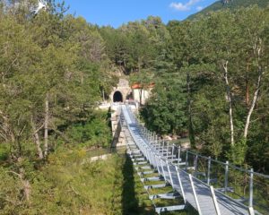 La nouvelle passerelle himalayenne, d’une longueur de 60 mètres, réhabilite une ancienne ligne de chemin de fer en voie verte. Pour une intégration harmonieuse, les culées de l’ancien ouvrage ont été conservées.